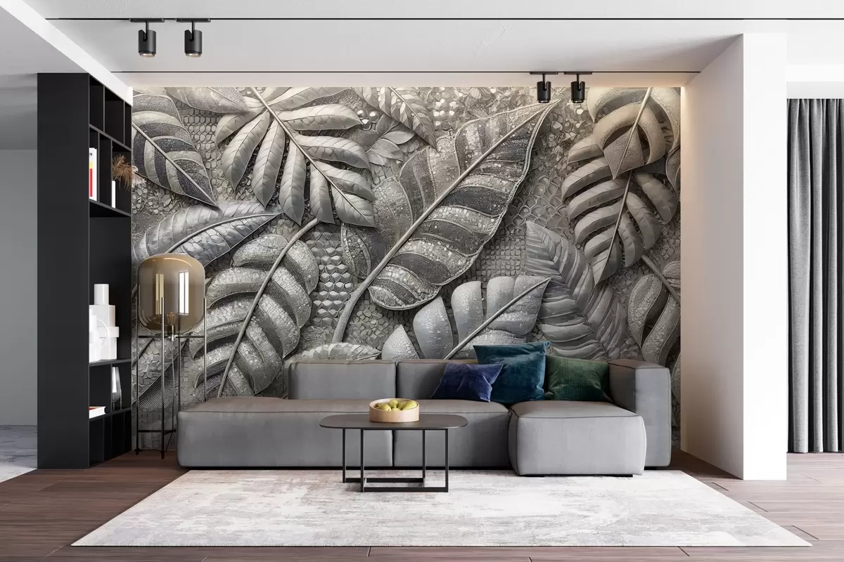 Fototapeten Große tropische Blätter in zarten Silbertönen, im Stil eines strukturierten Mosaiks N° w02135
