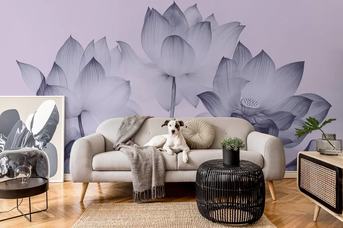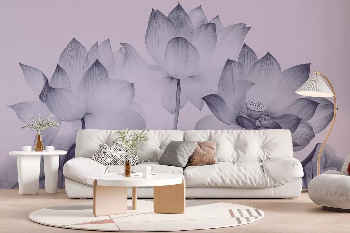 Fototapeten Drei Lotosblumen mit Blättern im Stil der chinesischen Malerei in blauer Farbe N° w02146v2