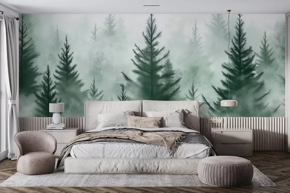 Fototapeten Wald im Nebel, Kiefern, Aquarell, grüne Farben N° w02152v1