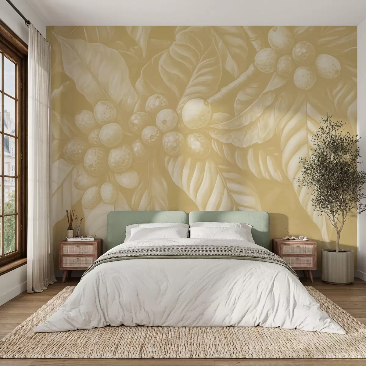 Fototapeten Zweige einer Kaffeepflanze mit Früchten und tropischen Elementen in Beigetönen N° w02209v1