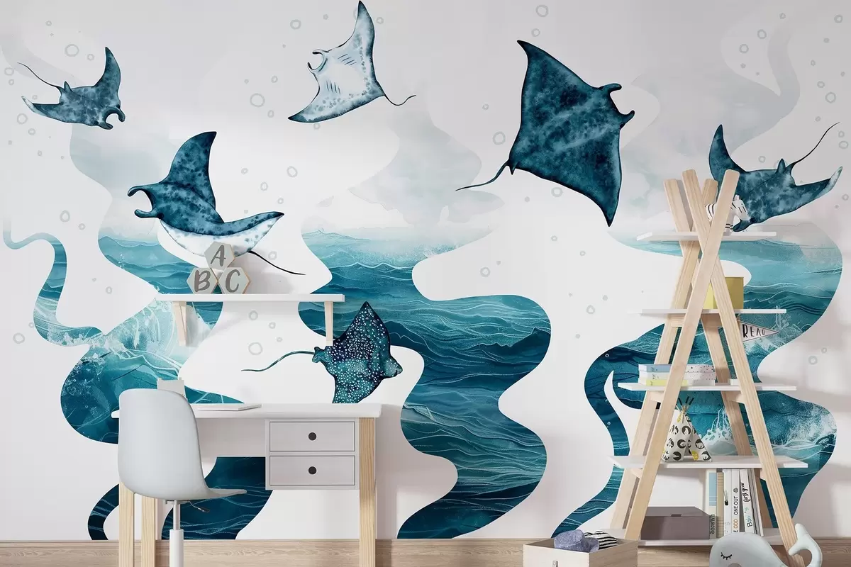 Fototapeten Manta Rochen Fisch, Aquarell-Stil, Meer, Ozean, blaue Farben N° w02266