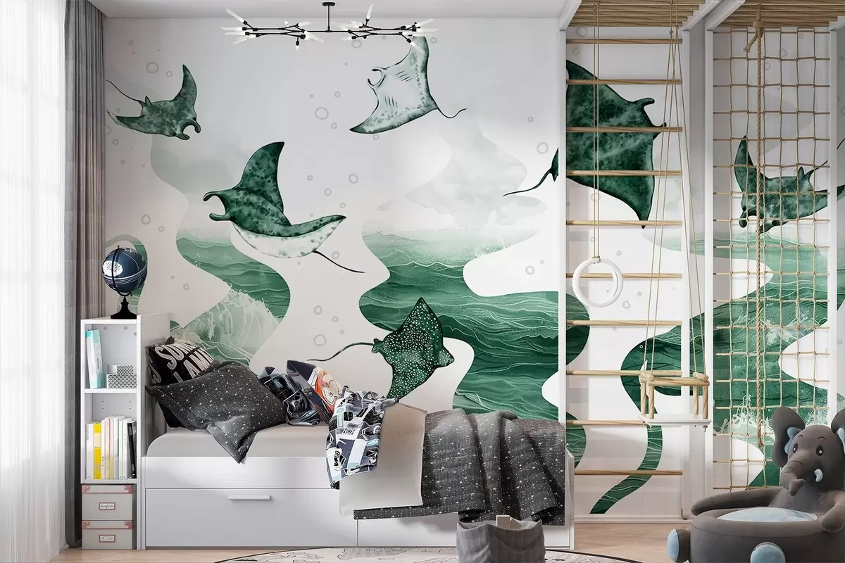 Fototapeten Manta Rochen Fisch, Aquarell-Stil, Meer, Ozean, grüne Farben N° w02266v2