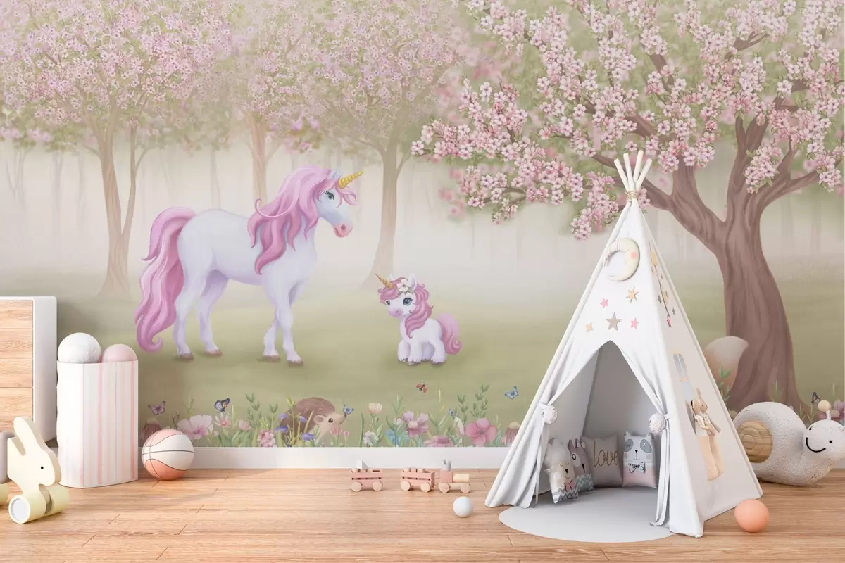 Fototapeten Einhörner in einem magischen Wald mit Tieren N° w02269