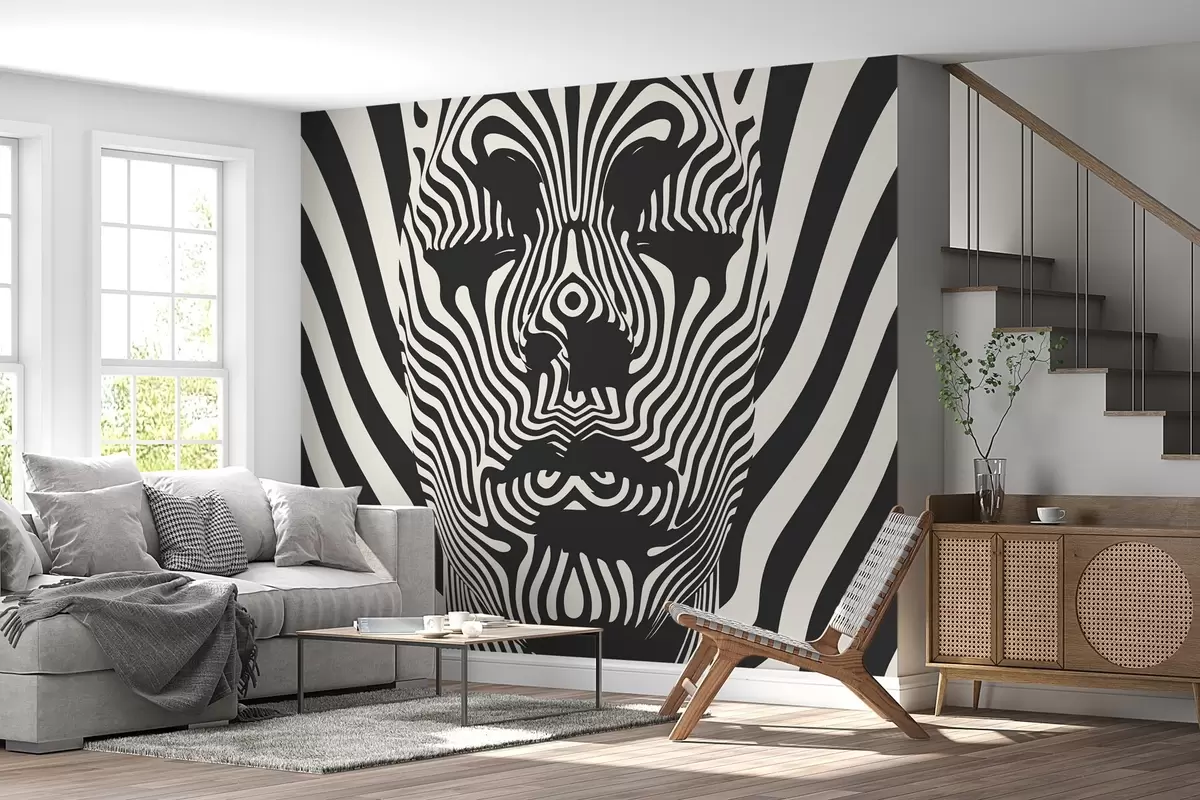Fototapeten Spalier im Op-Art-Stil mit abstraktem Gesicht, Wellenlinien auf hellem Hintergrund. N° w02285