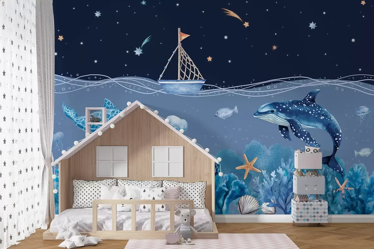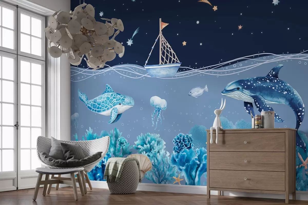 Fototapeten Meeresleben, Aquarellstil, Korallen, Boot, Delphin, Qualle, Sternenhimmel, blaue Farben N° w02310