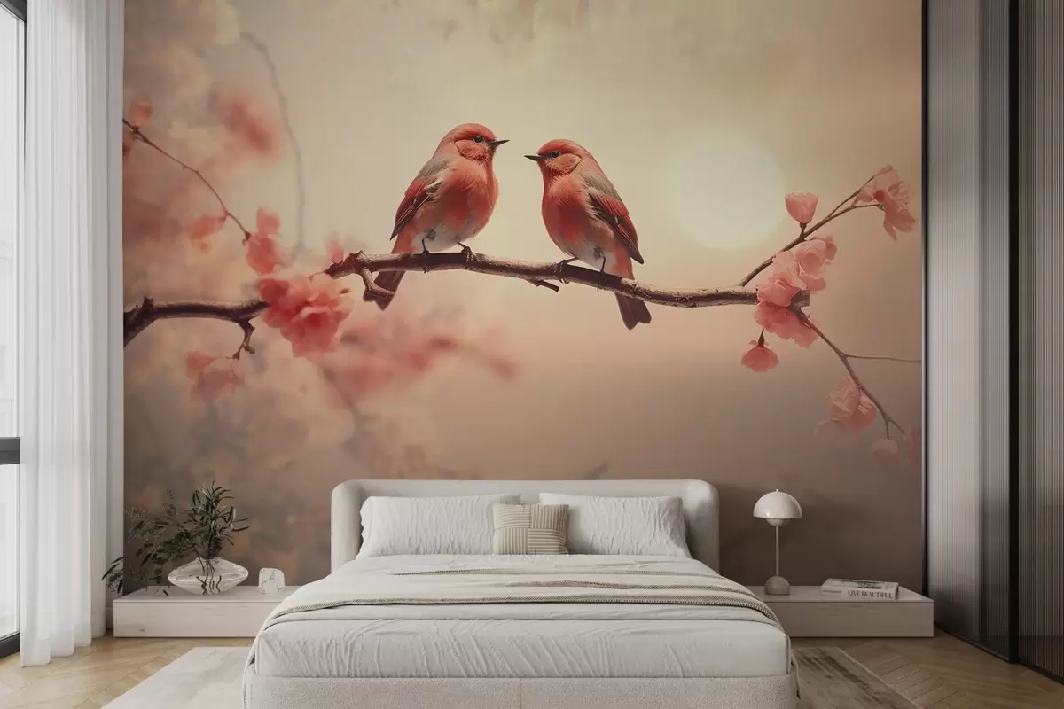 Fototapeten Eine heitere und romantische Szene mit zwei kleinen Vögeln, die auf einem zarten Zweig sitzen, der mit blassrosa Blumen verziert ist. N° w02343