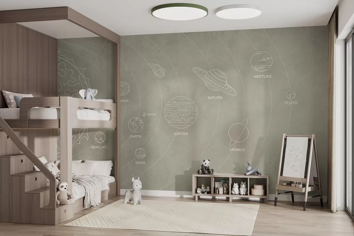 Fototapeten Sonnensystem im minimalistischen Stil auf einem kühlen beigefarbenen strukturierten Hintergrund N° w02344