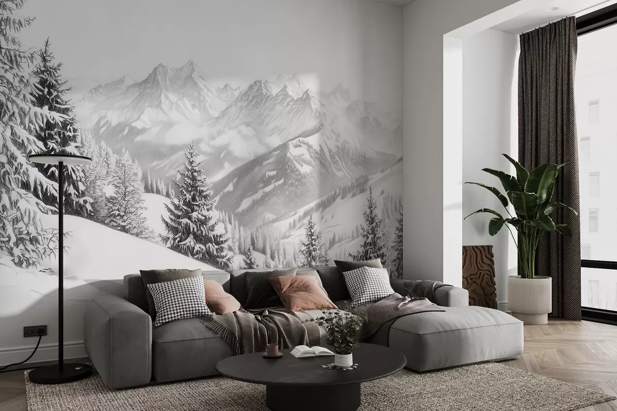 Fototapeten Winter in den Bergen, Wald, Alpen, Bleistiftzeichnung, Naturlandschaften N° w02353