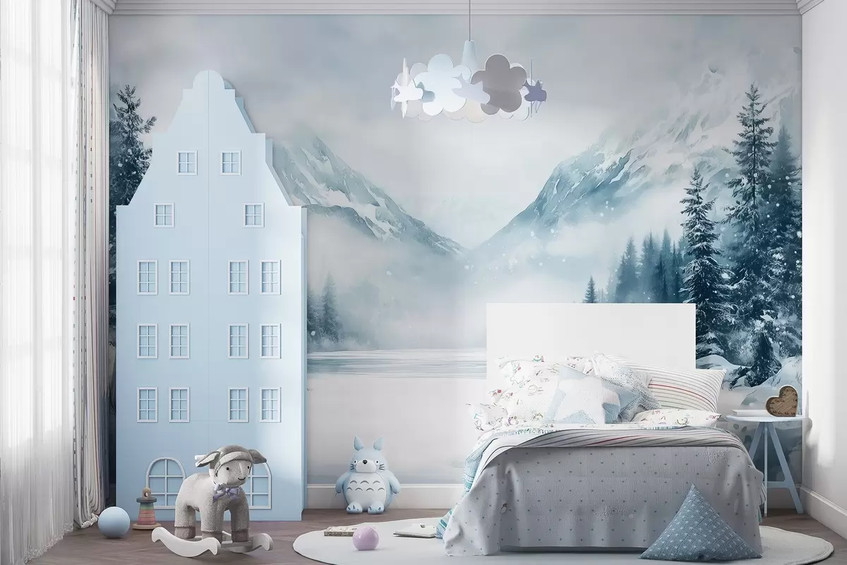 Fototapeten Alpine Berge im Schnee, Aquarell-Stil, Winter, blaue Farben, Tannenbäume N° w02356