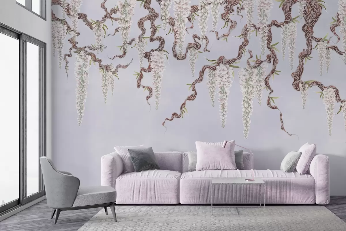Fototapeten Rosa Glyzinie auf einem hellen, pastellfarbenen Grunge-Hintergrund N° w02372v2