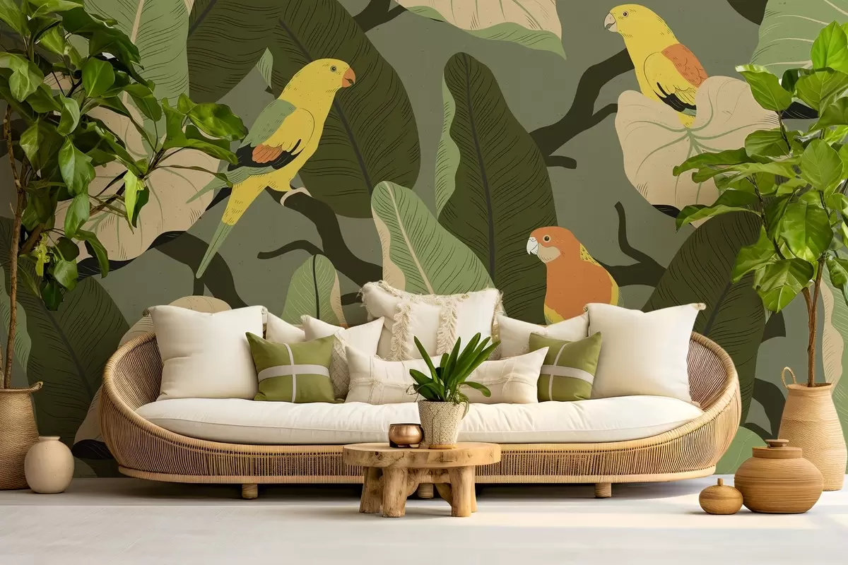 Fototapeten tropische Blätter mit Papageien N° w02402