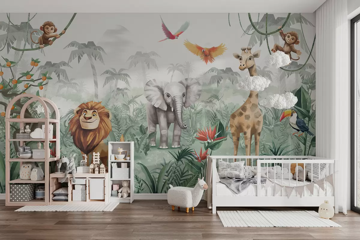 Fototapeten Kinder-Dschungel-Design mit Löwe, Giraffe, Elefant und Papageien N° w02440