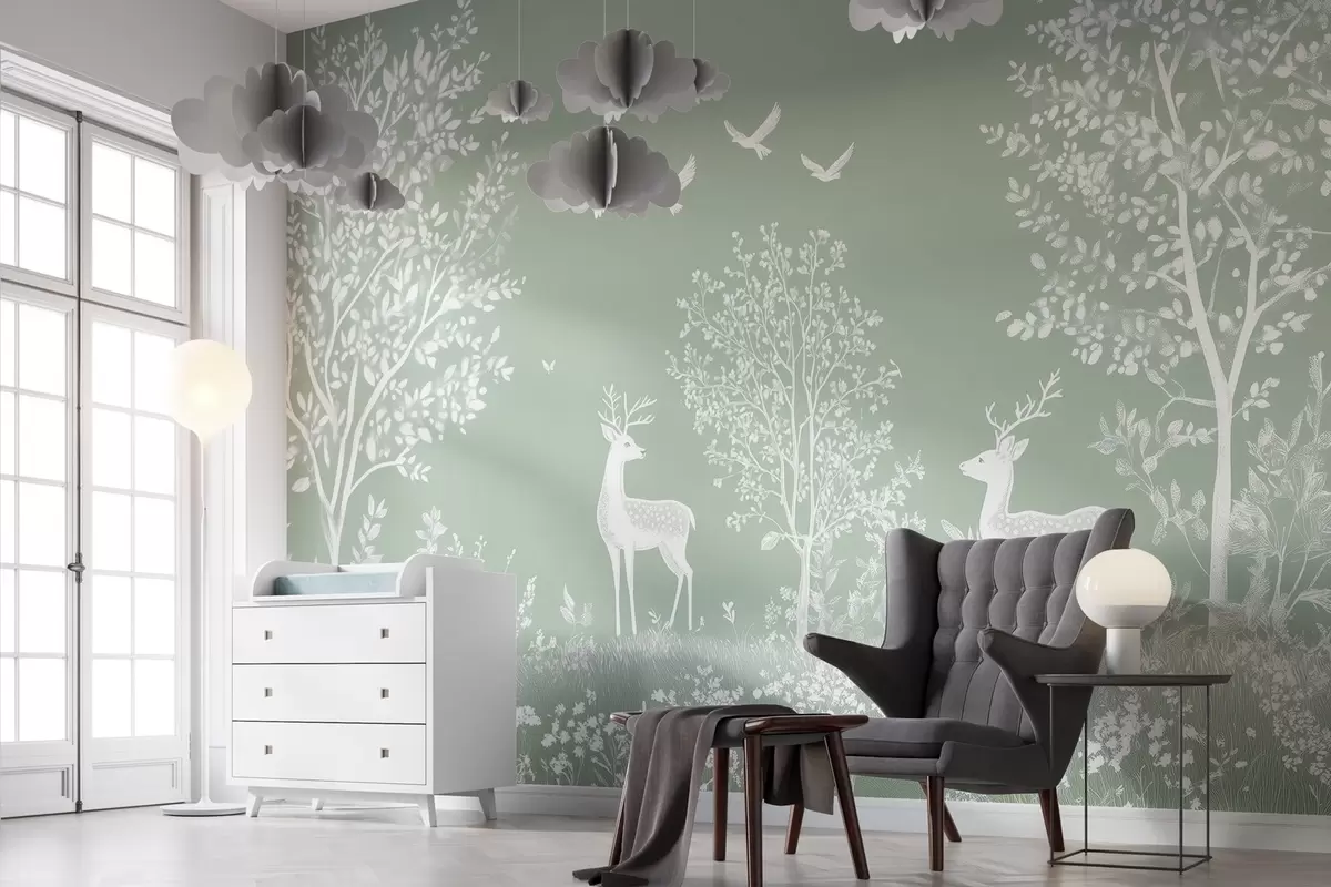 Fototapeten wald mit Hirschen im Stil einer Kreidezeichnung auf grünem Hintergrund N° w02444