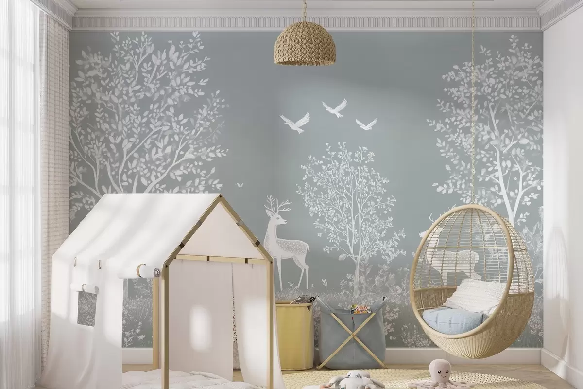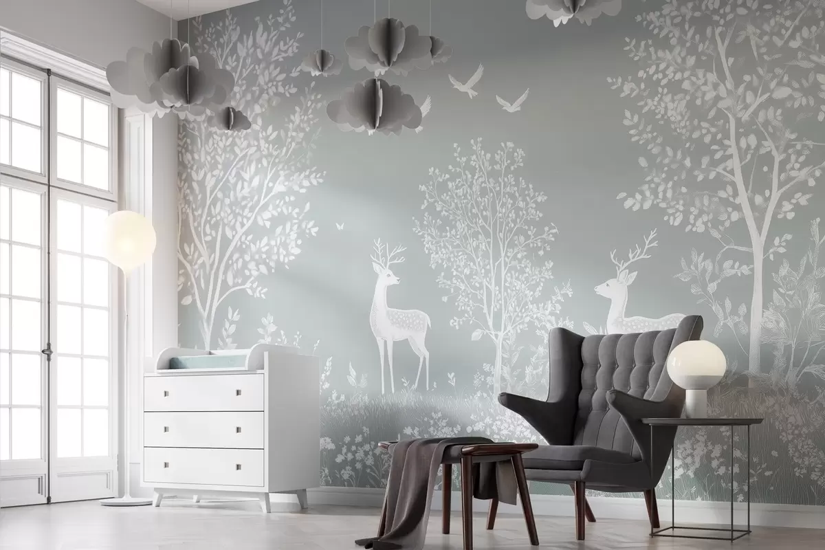 Fototapeten wald mit Hirschen im Stil einer Kreidezeichnung auf grauem Hintergrund N° w02444v2