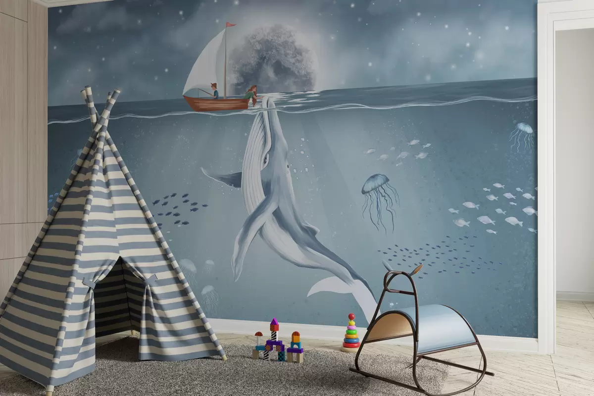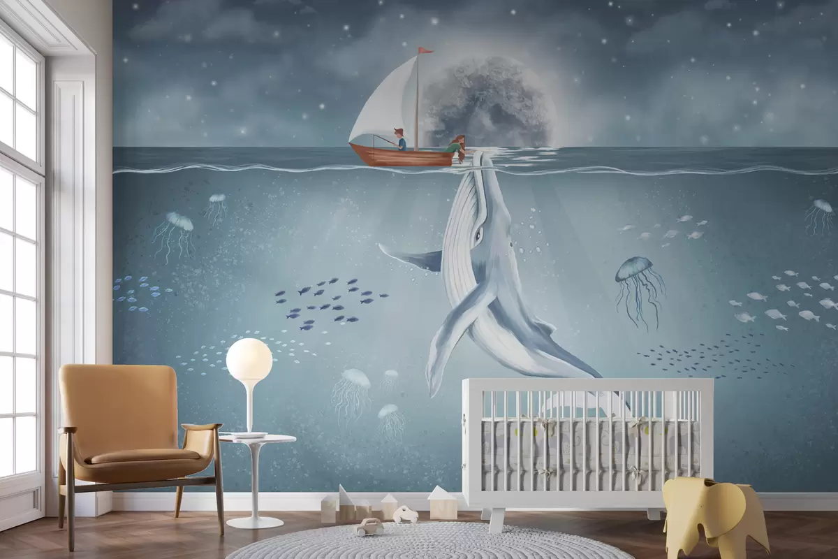 Fototapeten Kinderdesign mit Wal, Mond und Boot mit Kindern N° w02476