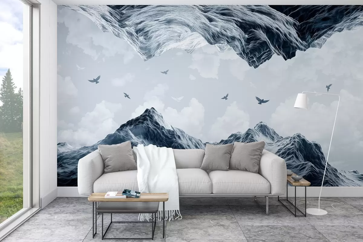 Fototapeten Berge Landschaft, Realismus, fliegende Vögel, Natur, Wolken, blaue Farben N° w02514v1