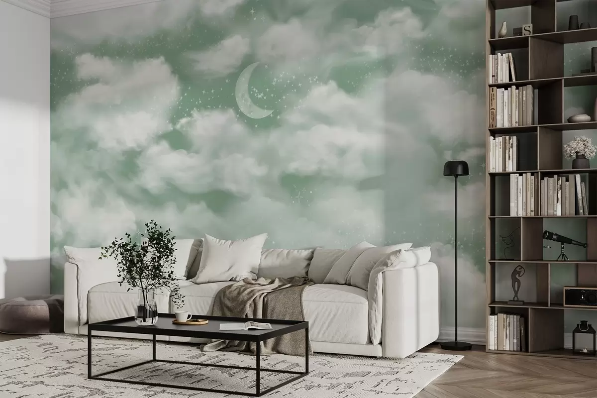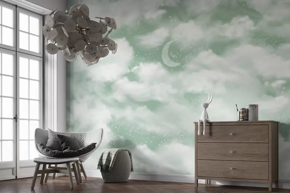 Fototapeten Sternenhimmel mit Mond und Wolken, verträumt, ätherisch, sanfte grüne Farben N° w02515v2