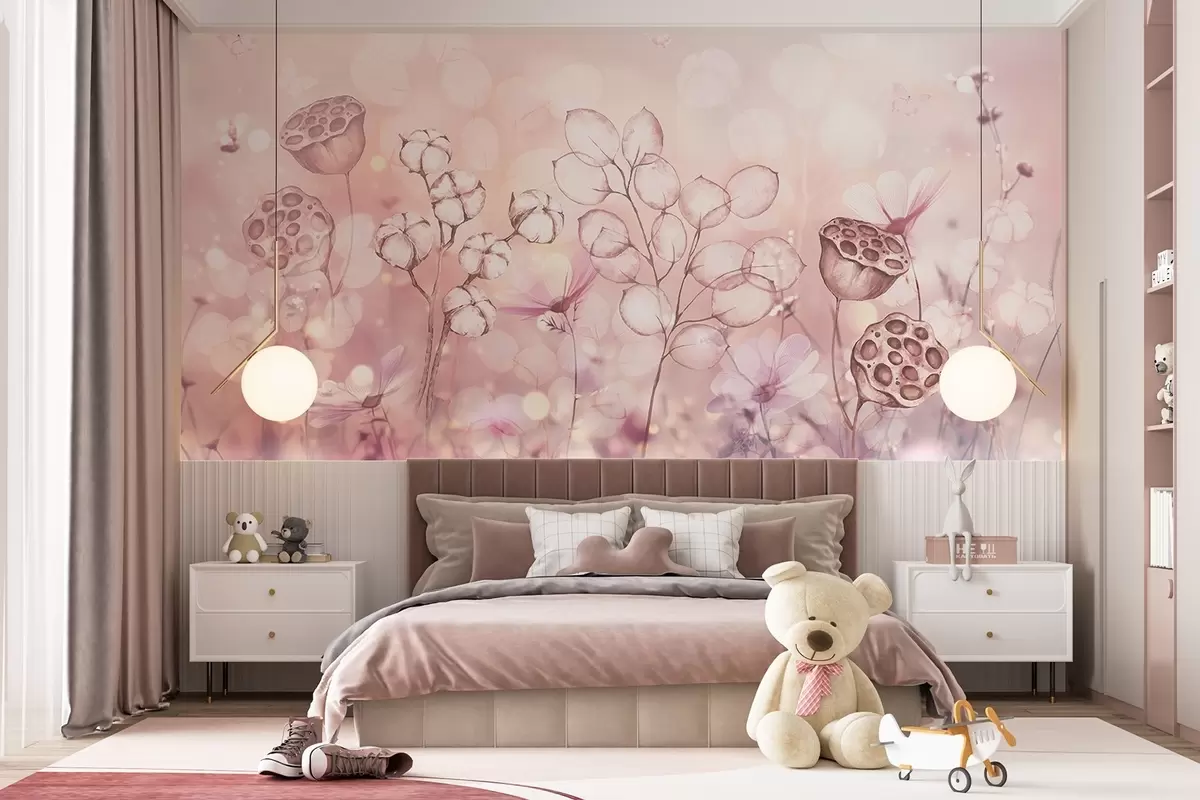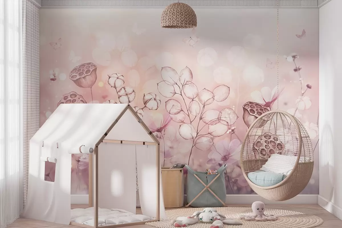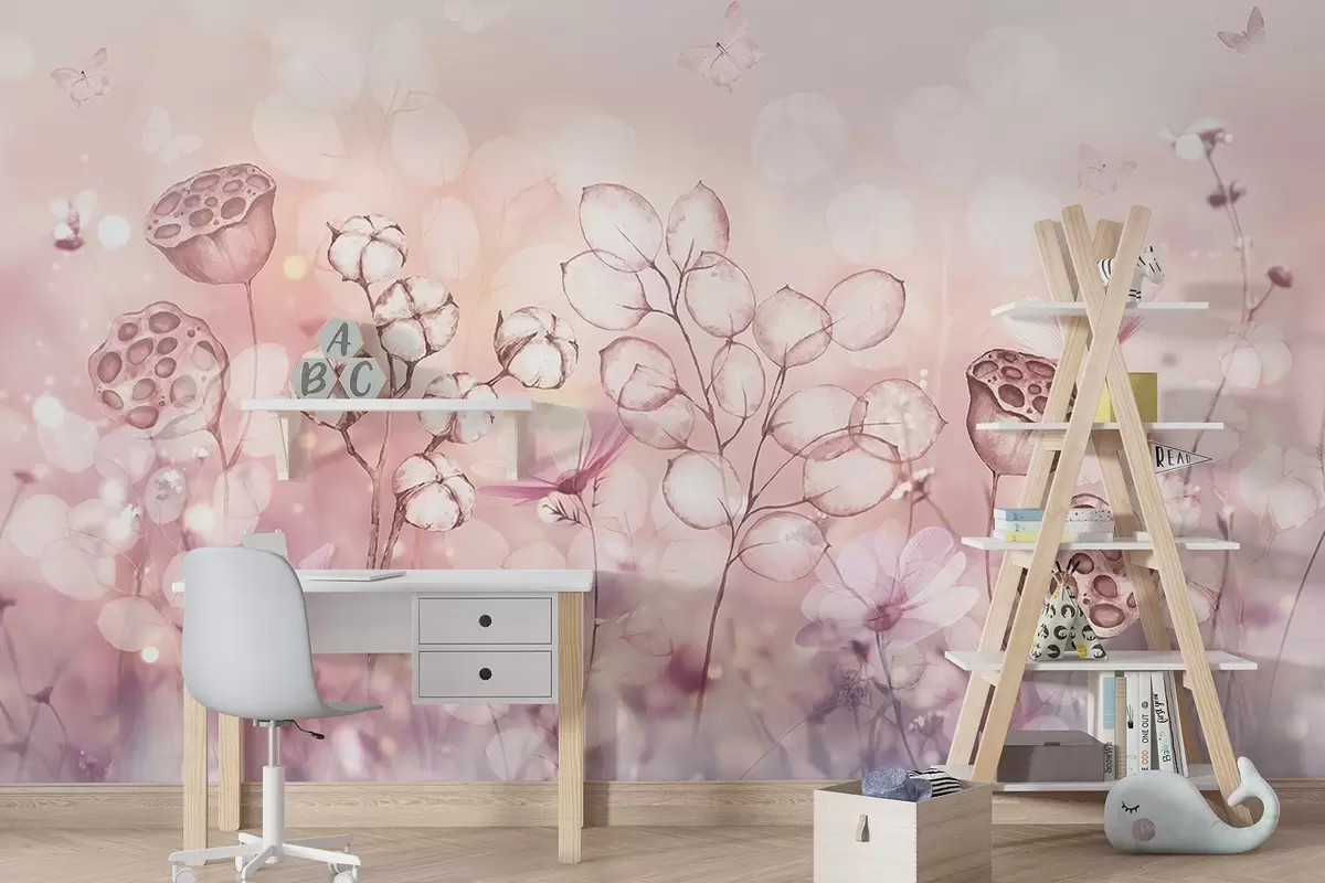 Fototapeten Verträumter Blumengarten, Schmetterling, Baumwollblumen, Lotusblumen, rosa Farben N° w02516