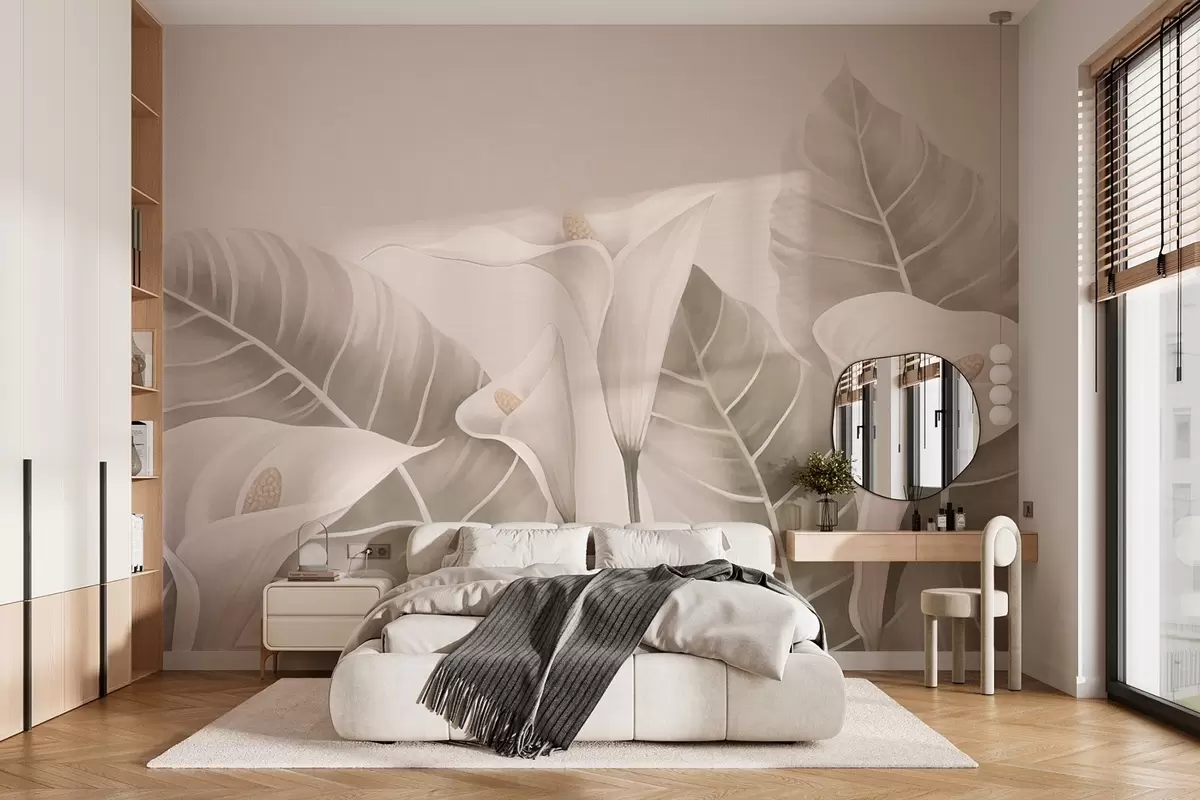 Fototapeten calla-Lilien auf einem Hintergrund aus Blättern N° w02568