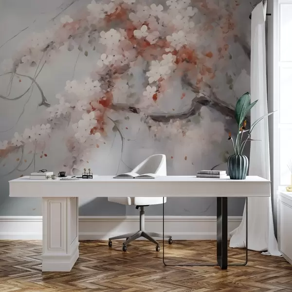 Fototapeten Abstrakter Zweig mit weißen und roten Blumen Nachahmung der Malerei N° w02594