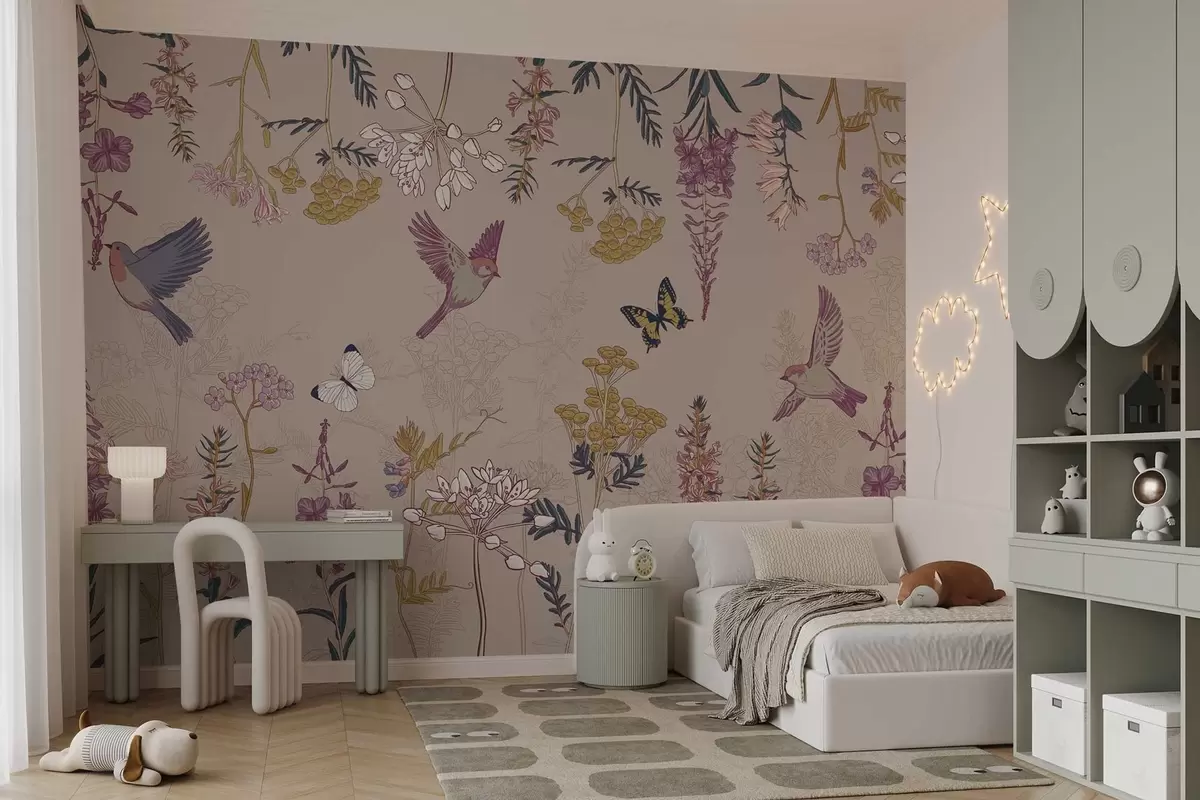 Fototapeten ein Ensemble aus Wildblumen und Vögeln auf beigefarbenem Hintergrund N° w02634