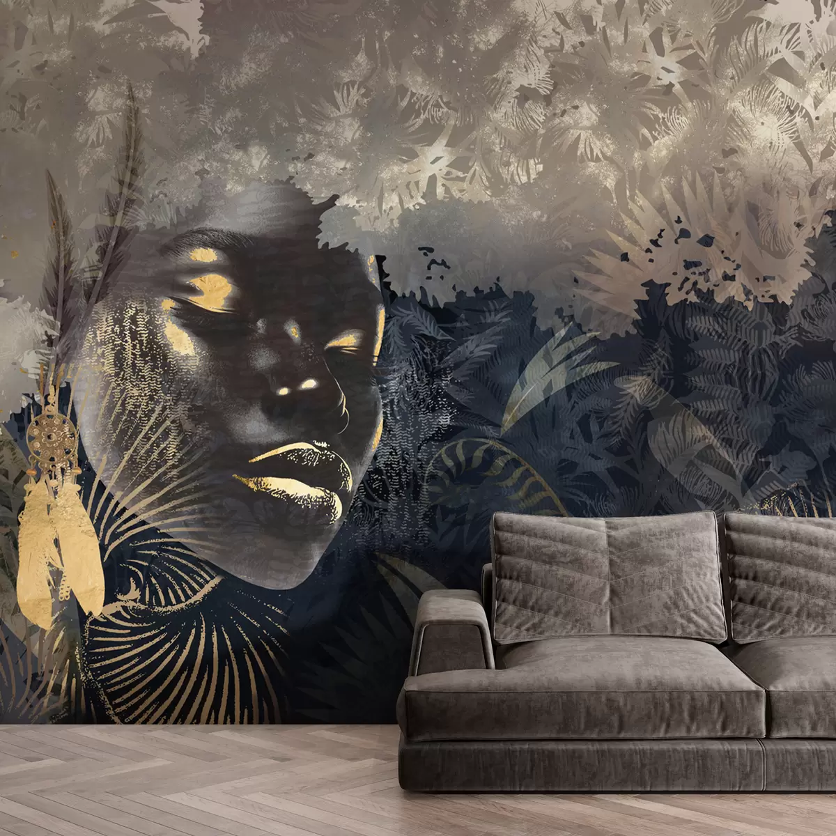 Fototapeten Magisches Afrika mit Regenwald, mädchenhafte und Vektor-Elemente mit blauer Tönung N° w02642v1