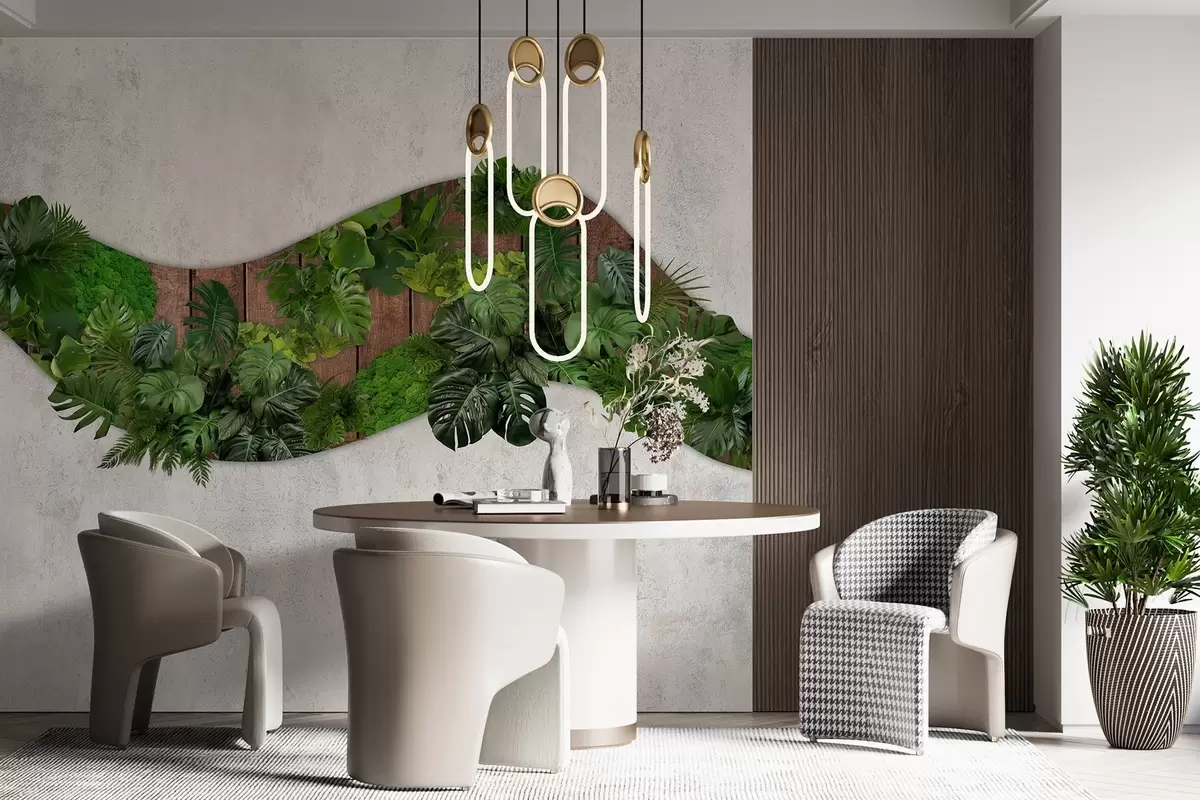 Fototapeten Wanddekoration mit Pflanzen, Moos, Palmenblättern, hölzernem Hintergrund N° w02658
