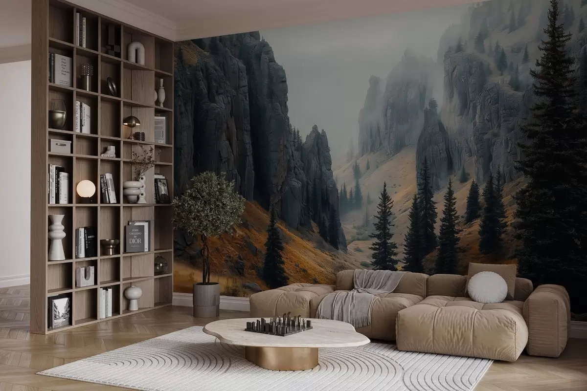 Fototapeten mystische Landschaft mit Felsen und Tannenbäumen N° w02682