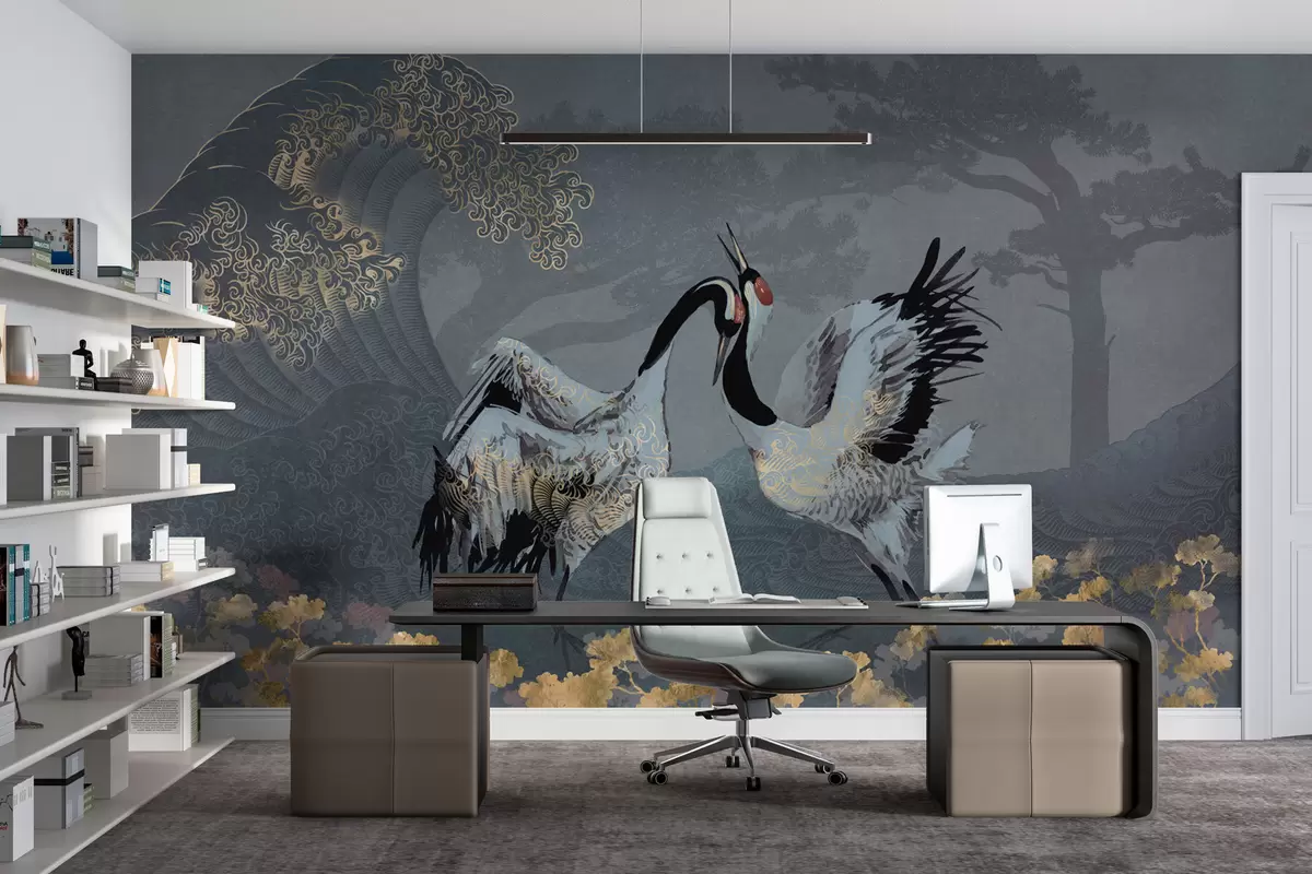 Fototapeten Kraniche, Bäume und Wellen mit chinesischen Stilelementen N° w02747