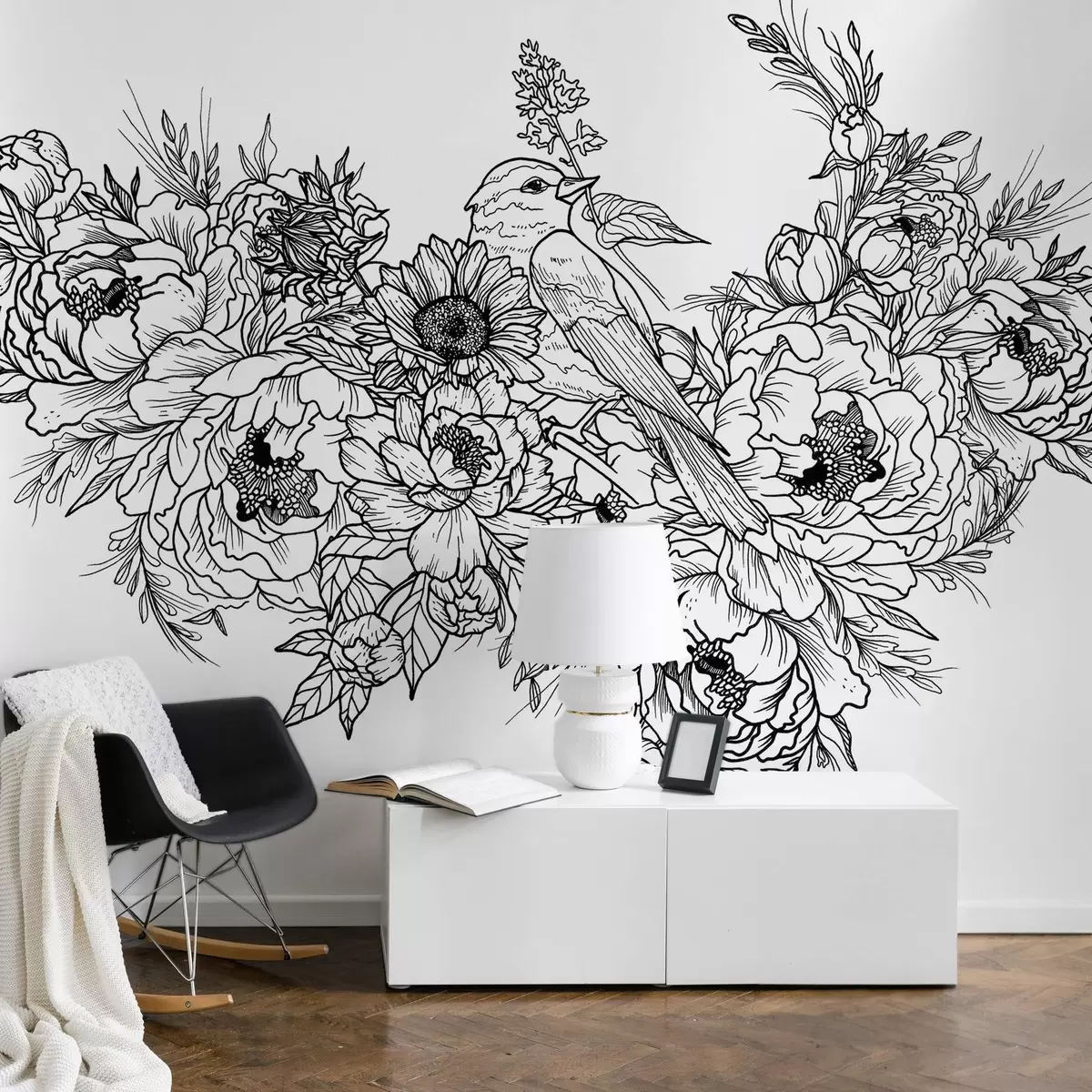 Fototapeten Detaillierte Strichzeichnung eines Vogel- und Blumenarrangements N° w02833v1