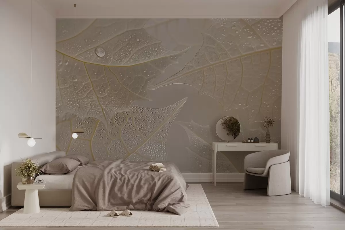 Fototapeten Nahaufnahme von Blättern mit Adern und Tautropfen in Beigetönen N° w02872