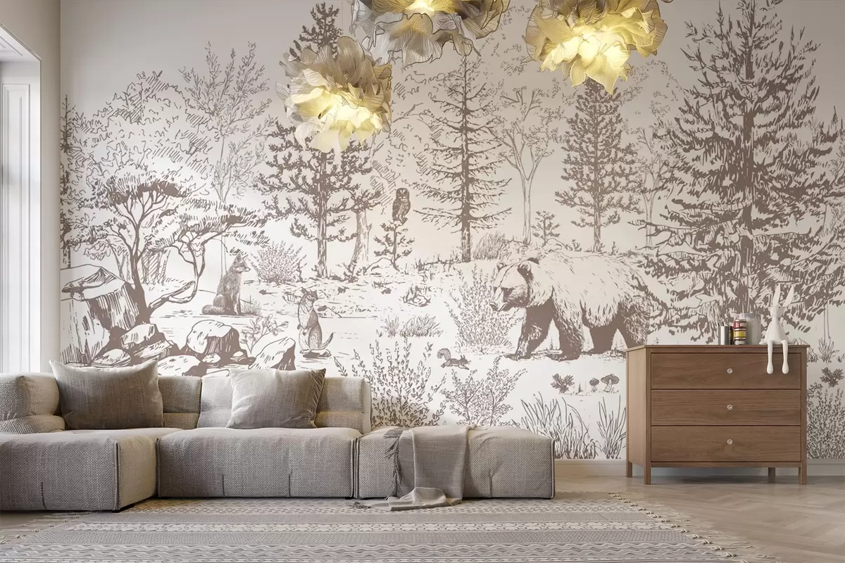 Fototapeten Waldleben, Bäume, wilde Tiere, Bär, Fuchs, Eule, Büsche, Bleistift-Stil Zeichnung, beige Farben N° w02929