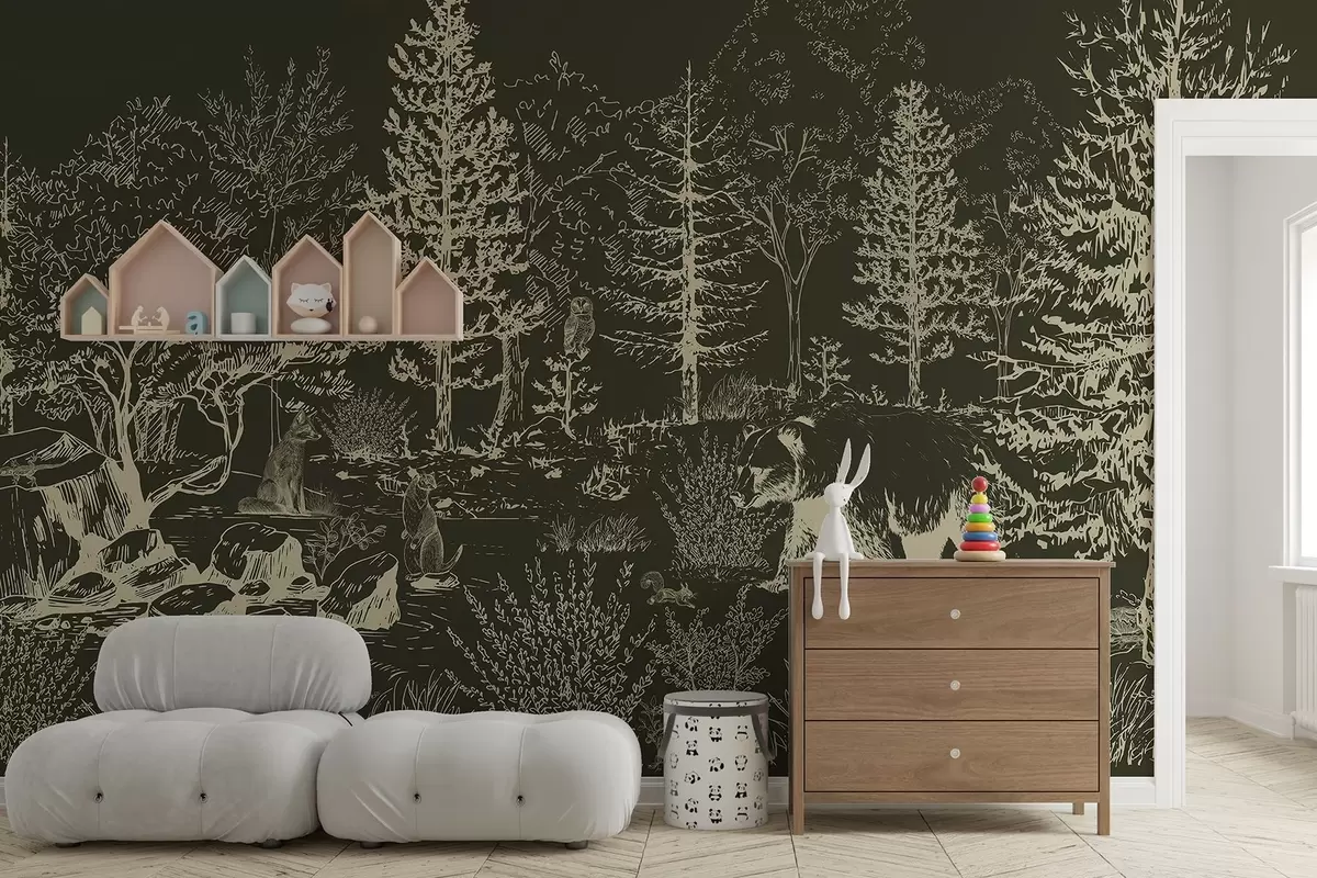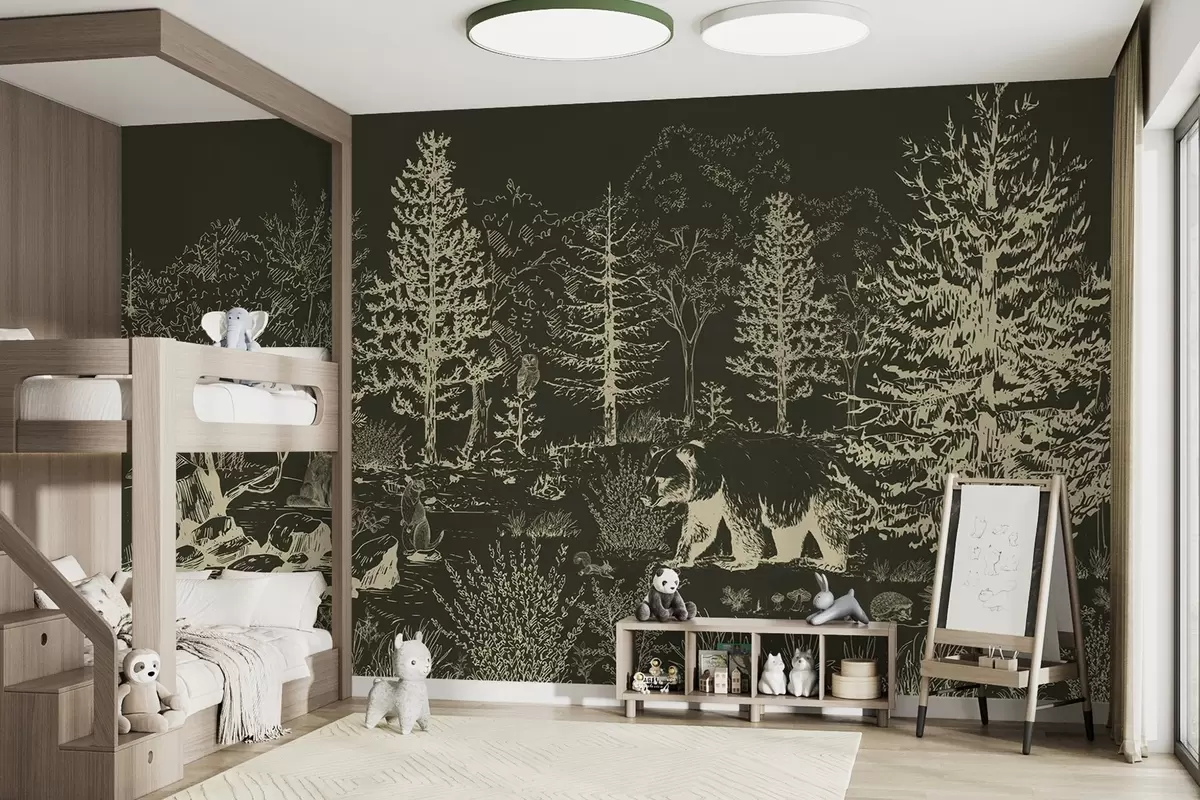 Fototapeten Waldleben, Bäume, wilde Tiere, Bär, Fuchs, Eule, Büsche, dunkelgrüner Hintergrund N° w02929v3