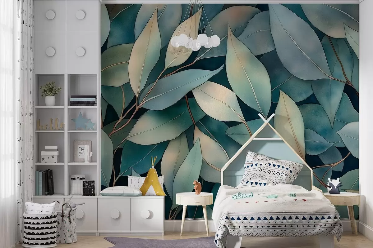 Fototapeten Eukalyptusblätter, Aquarell-Stil Zeichnung, florale Muster, grüne Farben N° w02931