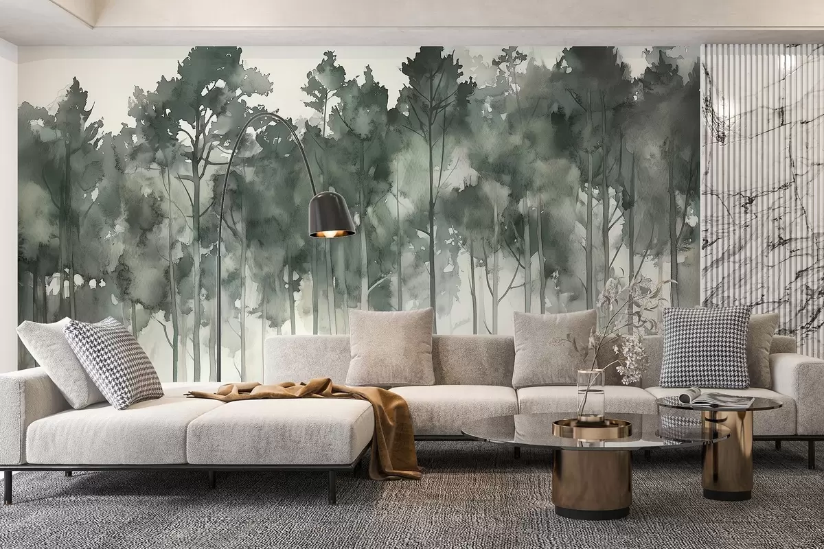 Fototapeten Aquarell-Stil Wald, Kiefern, Natur Landschaft, grüne Farben N° w02937