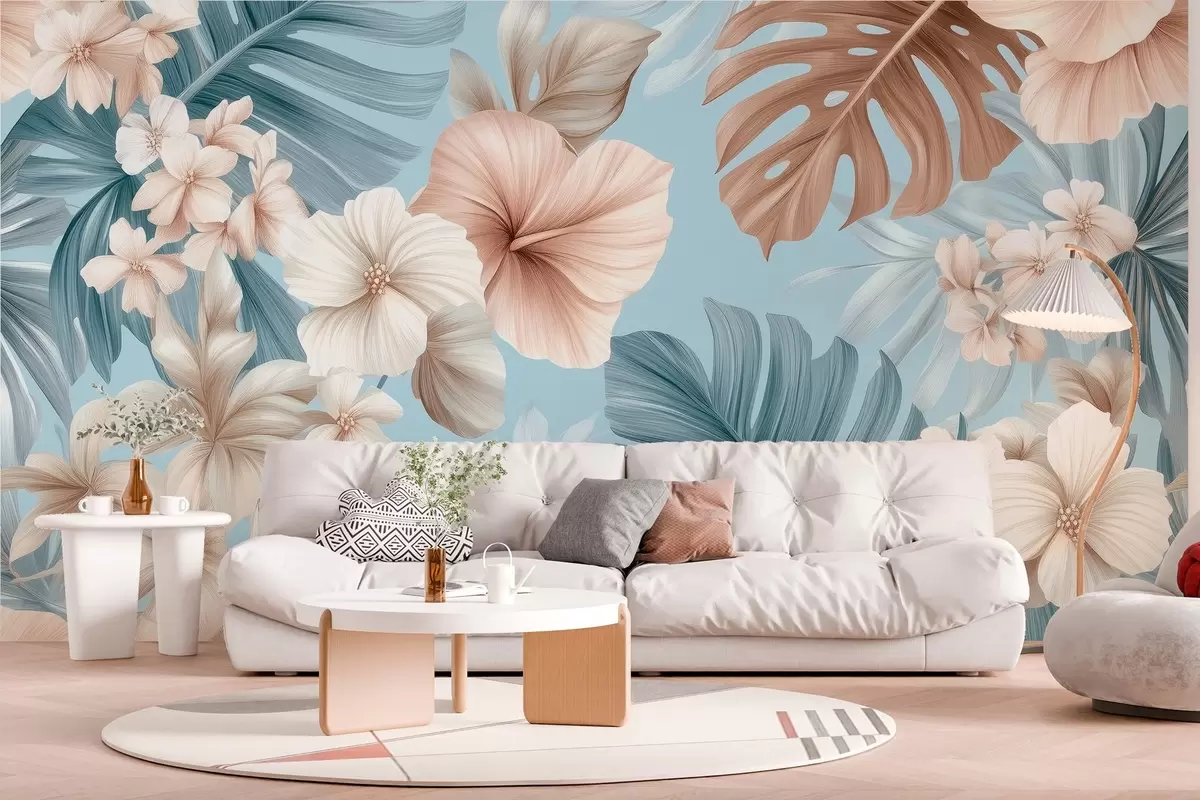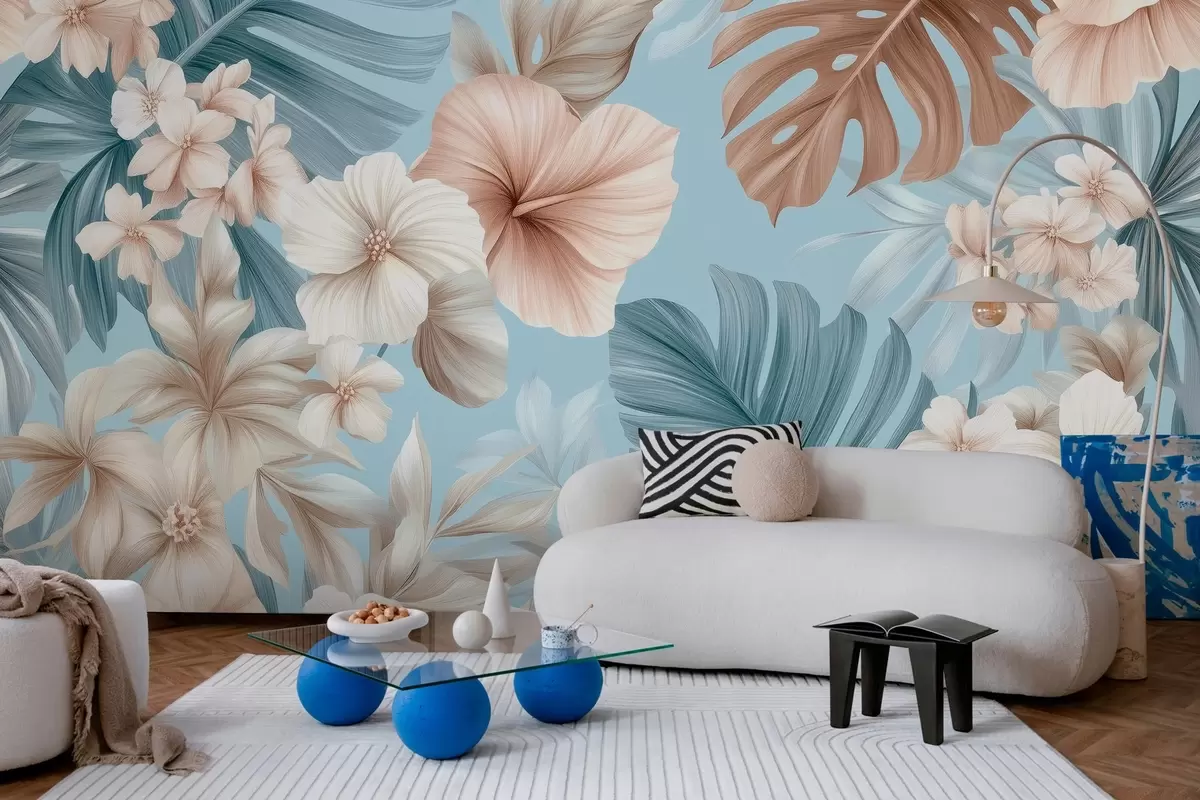 Fototapeten tropischer Druck mit großen Blättern und Blumen in Pastellblau und Beigetönen N° w03013