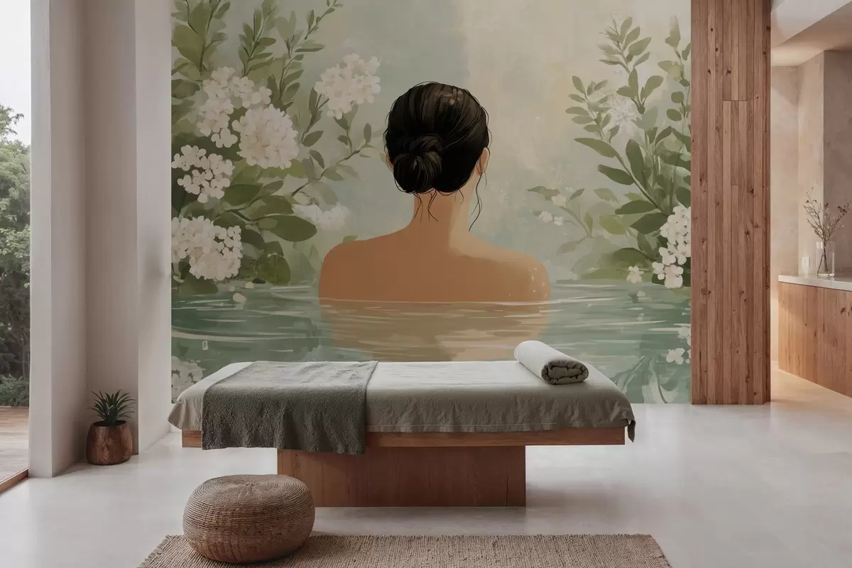Fototapeten eine heitere und verträumte botanische Illustration einer Frau, die in einem ruhigen, spiegelnden Gewässer badet, umgeben von üppigem Grün und zarten weißen Blumen. N° w03014