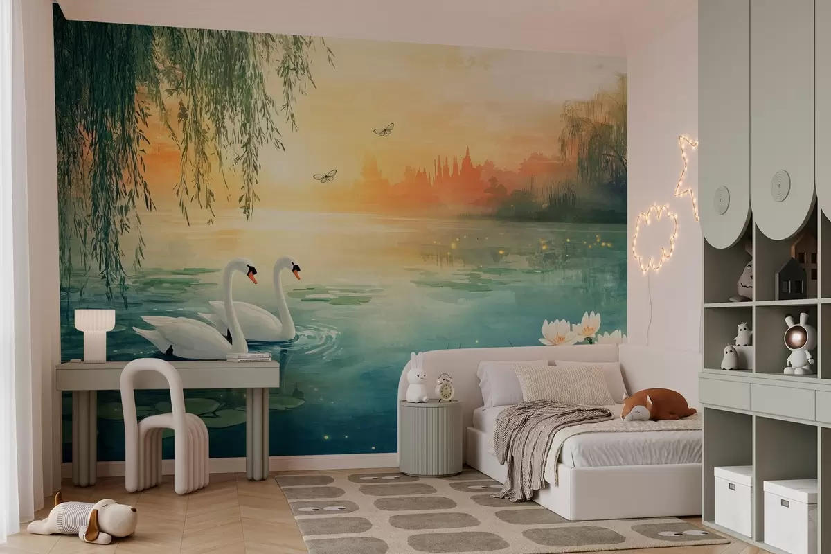 Fototapeten Romantische Landschaft im Stil der Ölmalerei mit zwei weißen Schwänen auf dem See N° w03017