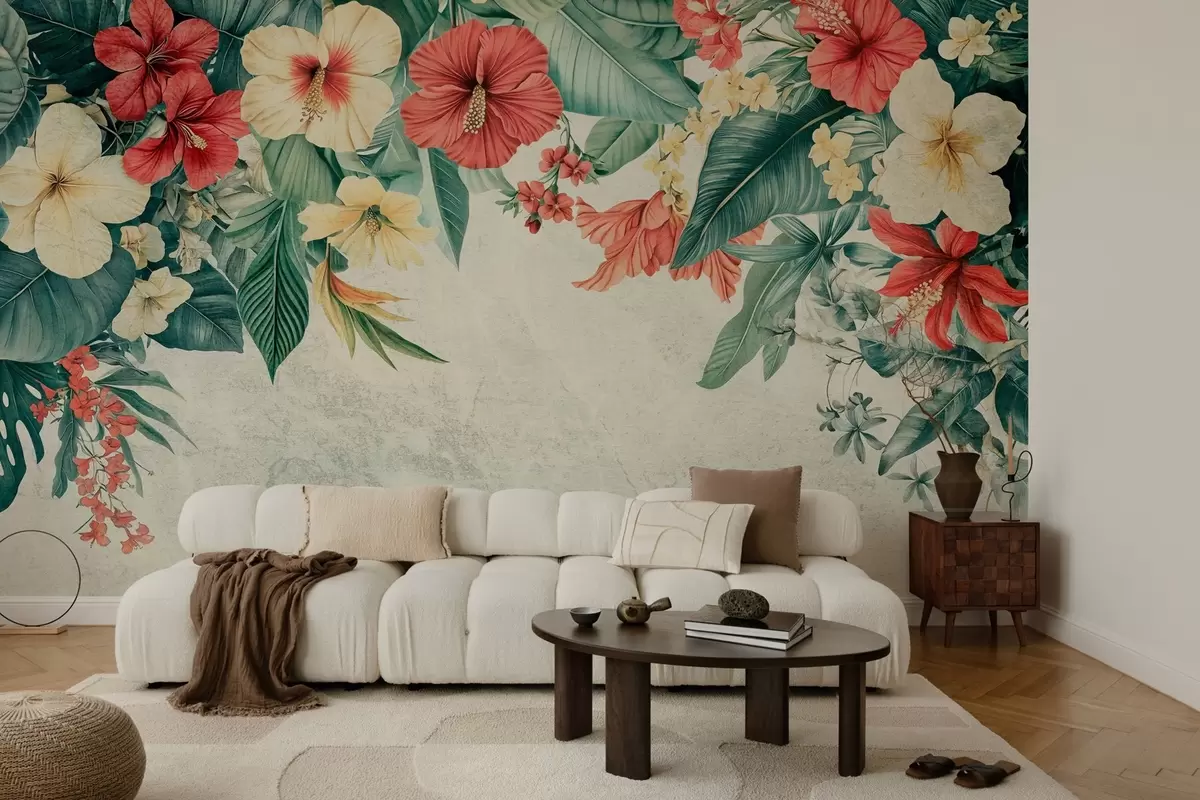 Fototapeten tropische Blumen und Pflanzen hängen von oben auf einem strukturierten Hintergrund N° w03023