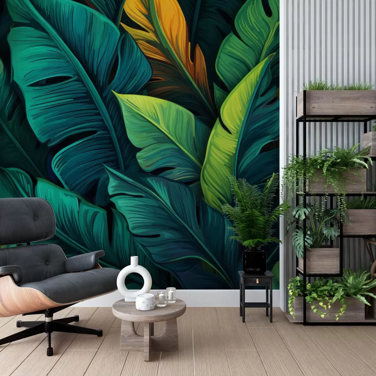 Fototapeten Lebendige tropische Blätter mit tiefgrünen, bläulichen und orangefarbenen Tönen N° w03078