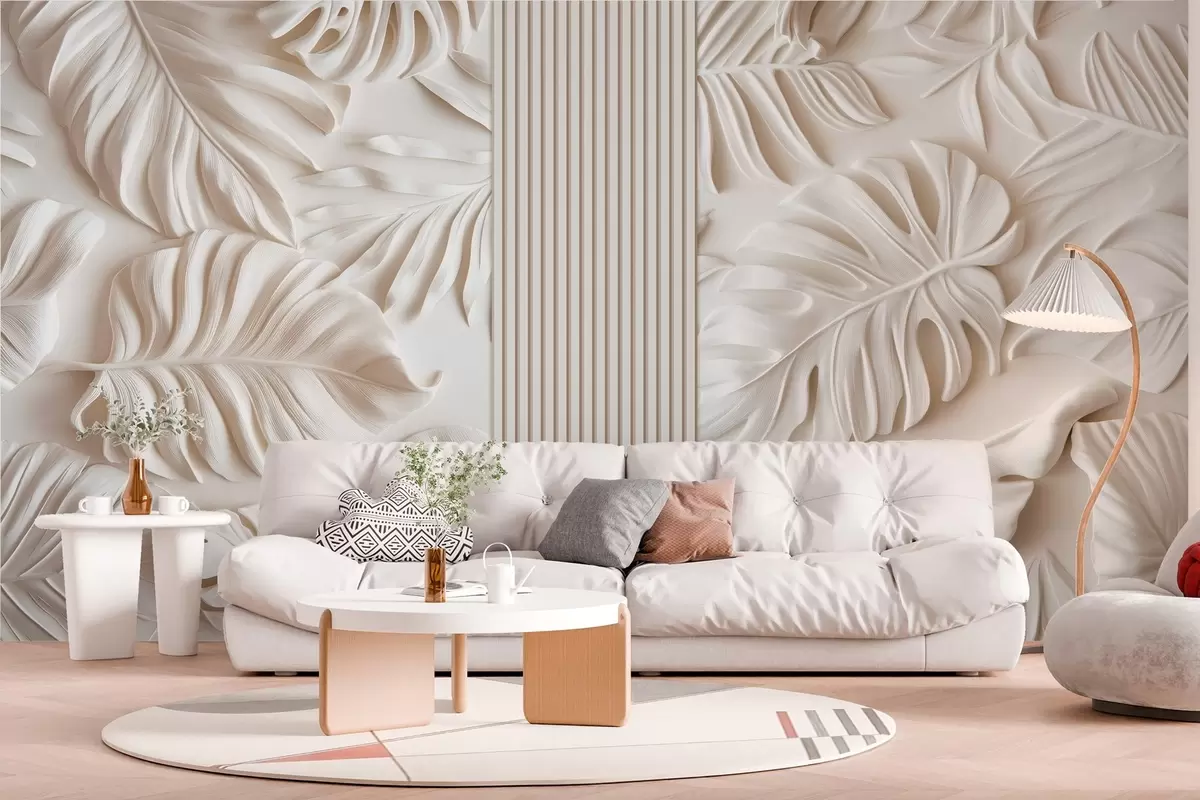 Fototapeten große tropische Blätter als Flachrelief und Tafeln in hellen Farben N° w03119