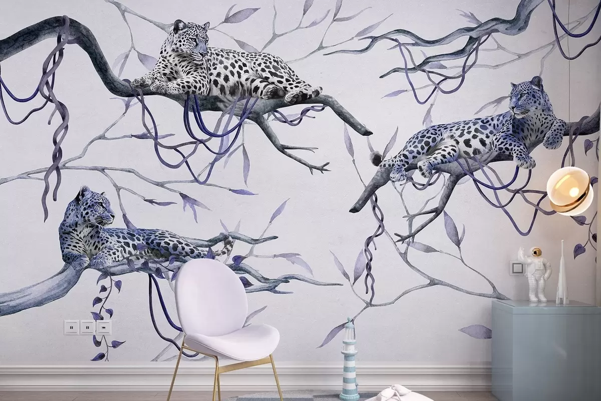 Fototapeten Leoparden auf den Dschungelbäumen, Lianen, tropische, wilde Tiere, lila Farbpalette N° w03146v3