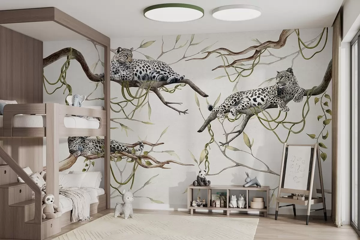 Fototapeten Leoparden auf den Dschungel-Bäumen, Lianen, tropische, wilde Tiere, Pastellfarben-Palette N° w03146v4