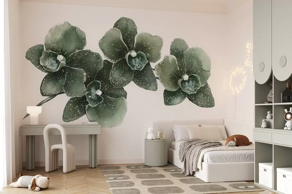 Fototapeten Orhid Blume Zweig, Aquarell-Stil, floral, grüne Farben N° w03165v1