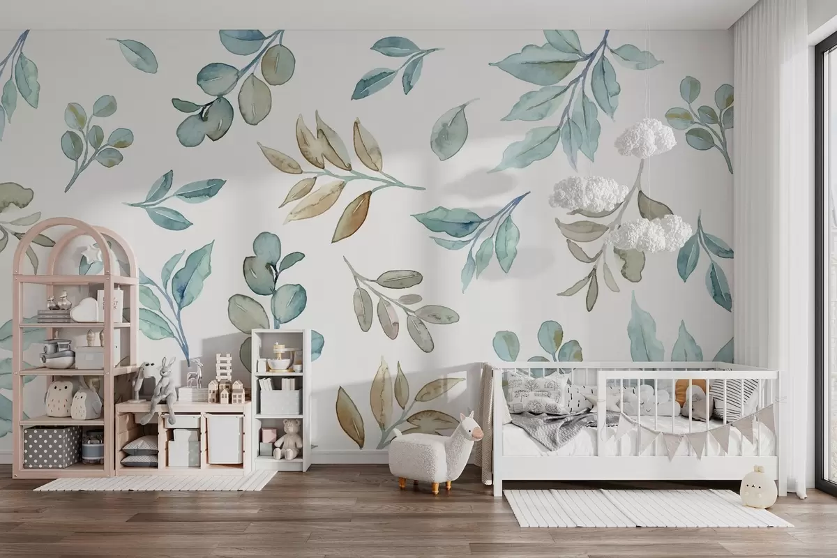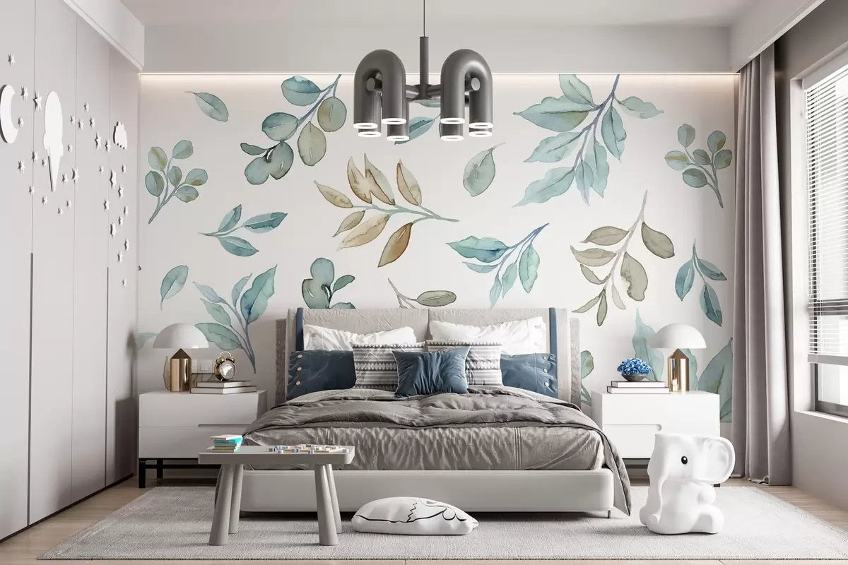 Fototapeten verschiedene Blätter und Zweige in Aquarelltechnik in Blau- und Beigetönen auf weißem Hintergrund N° w03280