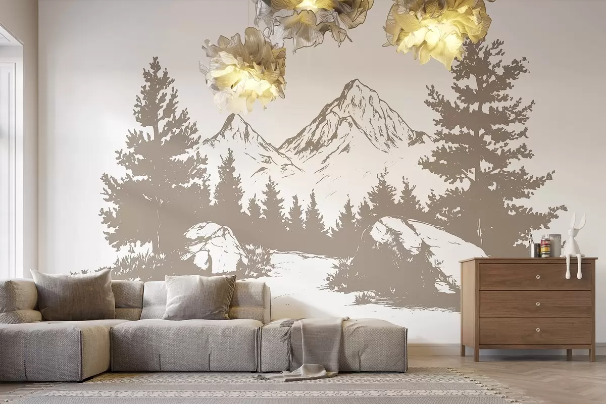 Fototapeten Die Alpen, Berge mit Wald, Strichzeichnung, beige Farbe N° w03342