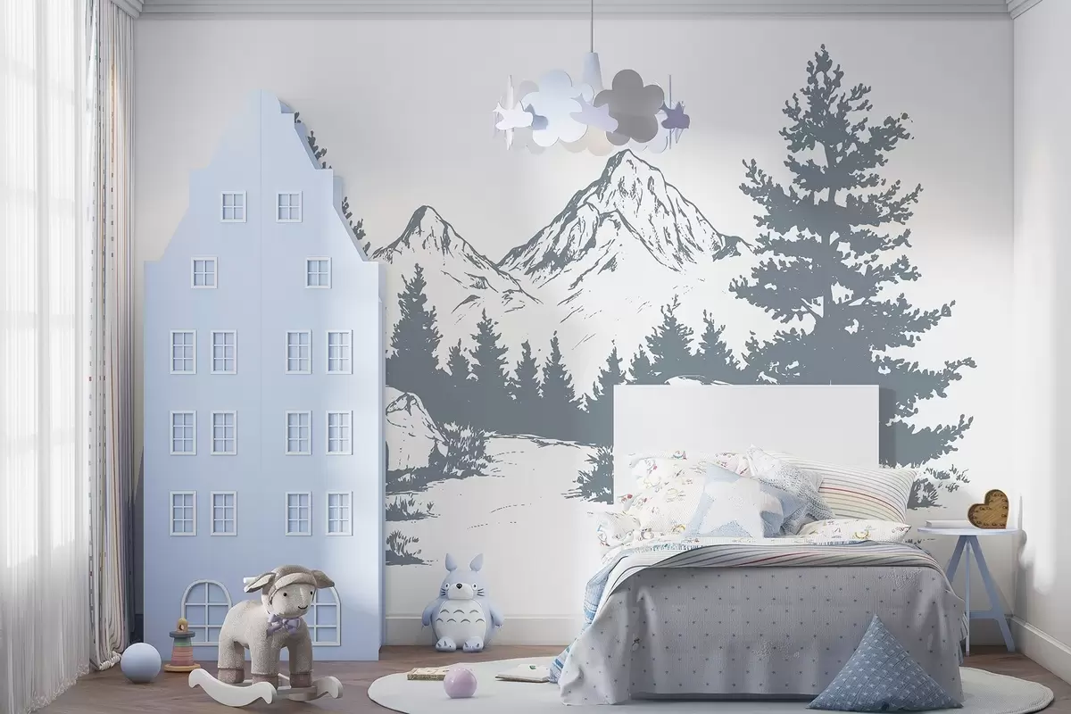 Fototapeten Die Alpen, Berge mit Wald, Strichzeichnung, graue Farbe N° w03342v2