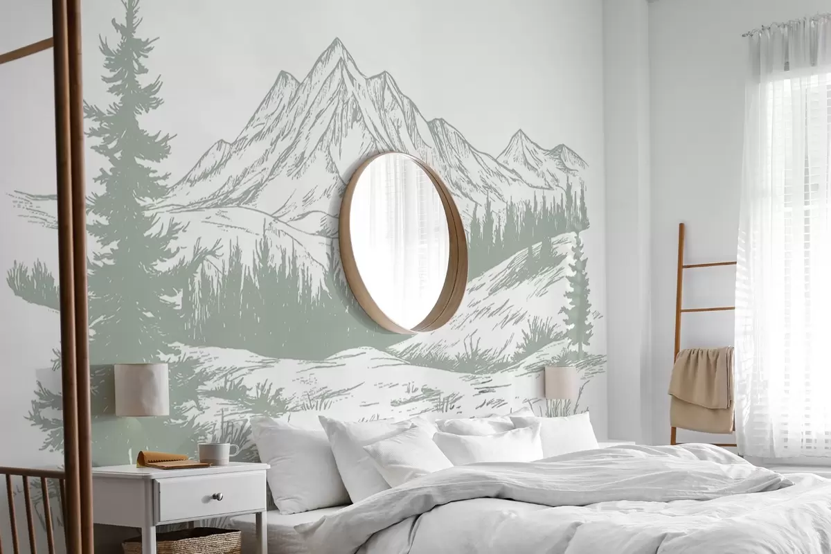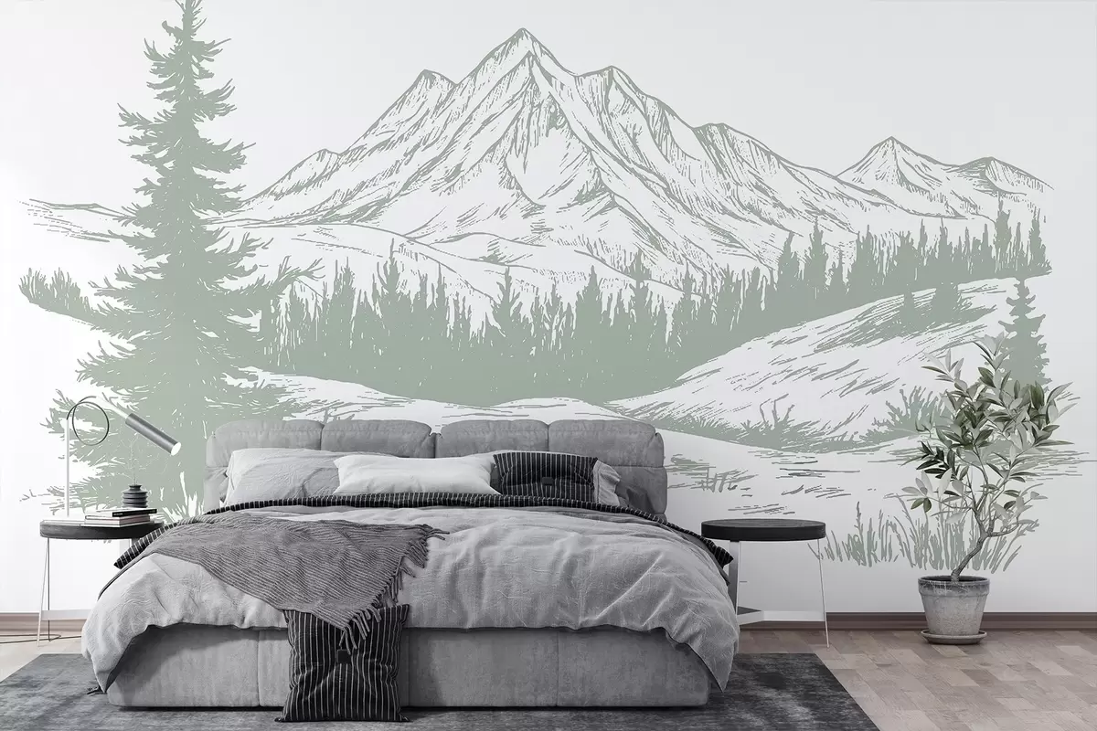 Fototapeten Berge Landschaft mit Kiefern, Wald, Natur, weiche grüne Farbe N° w03344v1
