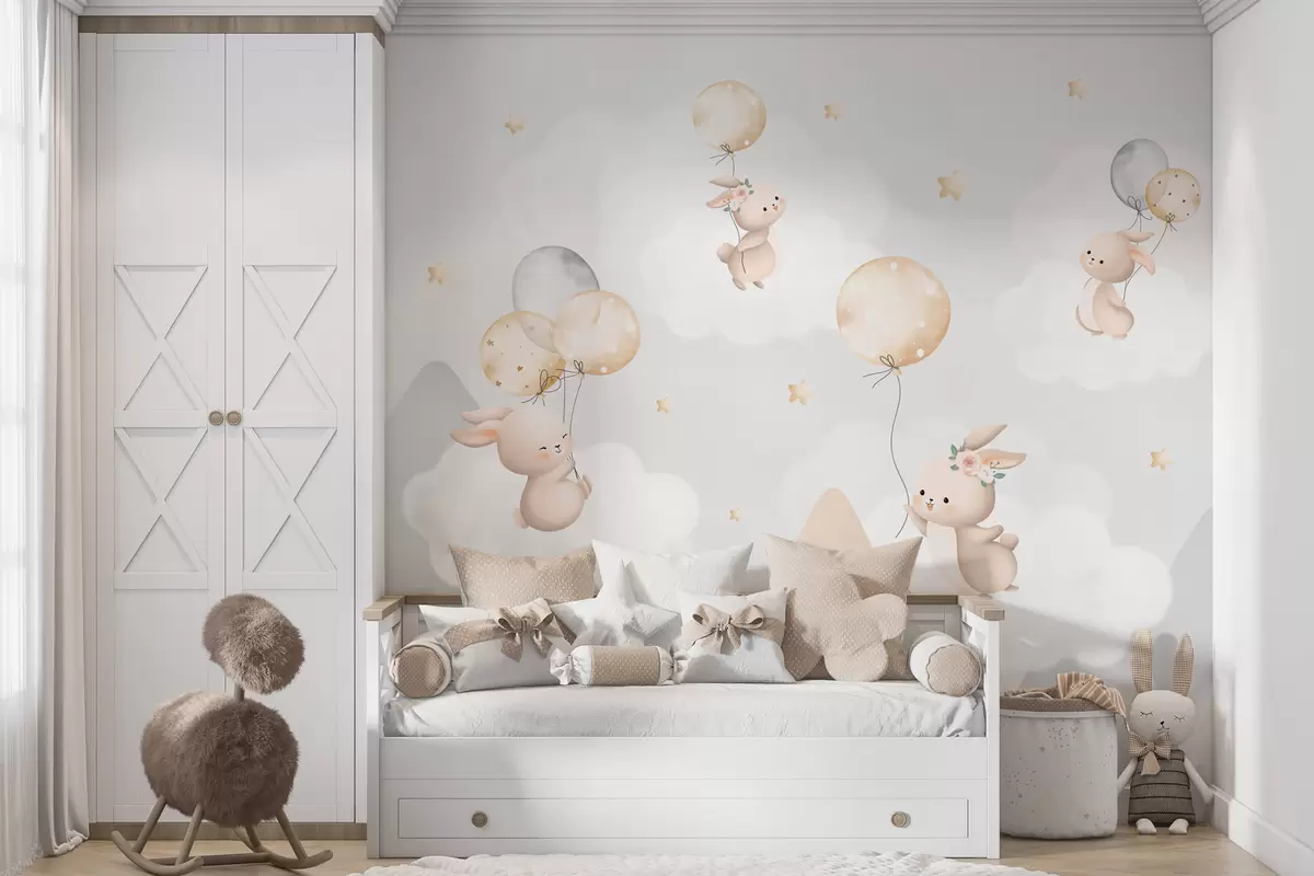 Fototapeten Hasen mit Luftballons auf Wolken zwischen Berggipfeln N° w03375v1