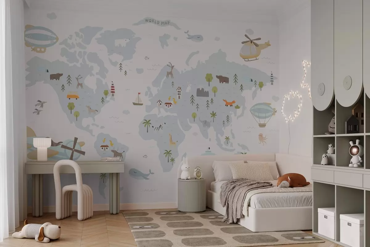 Fototapeten Kinderweltkarte mit Tieren und Flugzeugen N° w03392